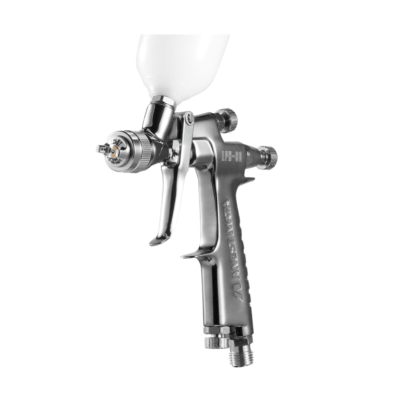 IWATA LPH-80 je kompaktna, visoko učinkovita HVLP mini pištola za natančno popravilo. Namenjena je servisom in delavnicam, kjer so pomembni nizka poraba zraka, minimalna poraba materiala in odlična atomizacija pri nizkih tlakih. Težka je le okoli 205 g (brez posode), na voljo pa je v različnih izvedbah šobe in z različnimi tipkami/posodicami.